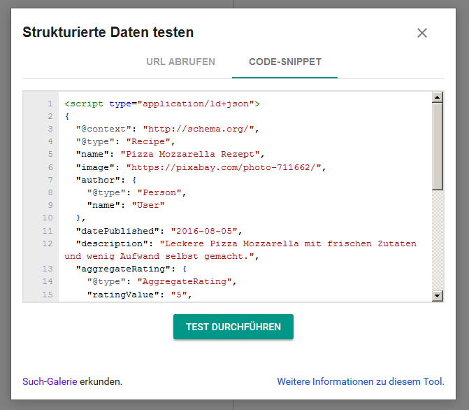 </script>Sie haben im Anschluss die Möglichkeit, dass Google Test-Tool für strukturierte Daten zu nutzen und damit Ihr Markup auf Fehler zu überprüfen. Starten Sie einfach einen neuen Test und geben entweder die URL Ihres Webprojektes oder nur das JSON-LD-Snippet an: