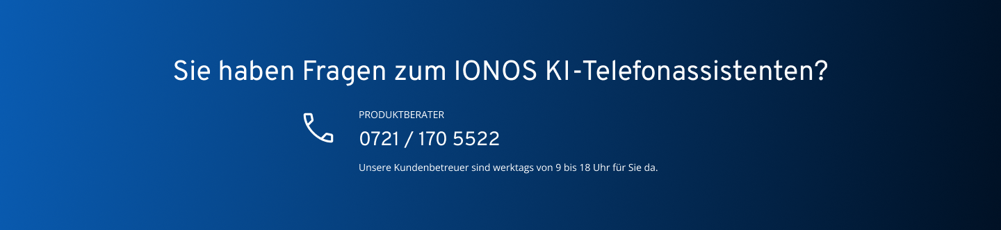 Ja, Ihre bestehende Geschäftsnummer müssen Sie weder ändern noch zu uns portieren. Die Integration erfolgt über eine einfache Rufumleitung, sodass Ihr Telefonservice für Ihre Kundinnen und Kunden unter Ihrer gewohnten Nummer erreichbar bleibt. Sie entscheiden selbst, wann der KI-Telefonassistent einspringen soll – so stellen Sie sicher, dass kein Anruf mehr unbeantwortet bleibt. In Ihrem IONOS Paket ist zudem eine eigene neue Telefonnummer inklusive, die als Ziel für diese Weiterleitung dient oder direkt als Anrufnummer genutzt werden kann.