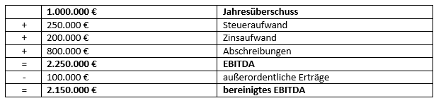 Da das zweite Unternehmen bei gleichem Jahresüberschuss weniger Steuern zahlen muss und auch bei Zinsen und Abschreibungen viel geringere Kosten verzeichnet, fällt das EBITDA um einiges kleiner aus als bei dem ersten. Man würde demnach dem zweiten Unternehmen einen geringeren Erfolg im Geschäftsbetrieb attestieren. Beim zweiten Unternehmen entspricht zudem das „adjusted“ EBITDA dem unbereinigten, da es in dem Geschäftsjahr weder außerordentliche Erträge noch außerordentliche Aufwendungen zu verzeichnen hatte.